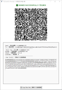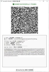 签名成功。生成了 十六进制的交易信息,点击复制内容可以复制到记事本,或者扫码获得交易数据。我们这里测试环境仍然使用 nextBTC的客户端控制台广播交易。在比特币主网中操作的话,可以使用支持广播交易的钱包软件扫二维码进行广播,或者区块浏览器的广播功能广播交易。