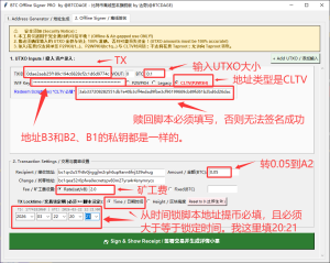 另外,第二步除了填写接收地址、找零地址、发送金额和手续费之外,还需要填写Locktime。而且这个值必须≥生成地址时填写的Lock Until。