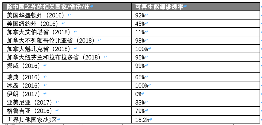 下面,让我们再回到比特币挖矿的水电可再生资源利用上。如果说60%的水力发电挖矿都发生在中国,那么剩下40%在全世界是如何分布的呢?CoinShares估计全球水电挖矿的比特币算力中,35%是在华盛顿、纽约、不列颠哥伦比亚省、阿尔伯塔省、魁北克省、纽芬兰和拉布拉多、冰岛、挪威、瑞典、格鲁吉亚和伊朗之间平均分配了。不过,这些地区的可再生能源渗透率参差不齐,有的渗透率高达100%,有的则低至0%。